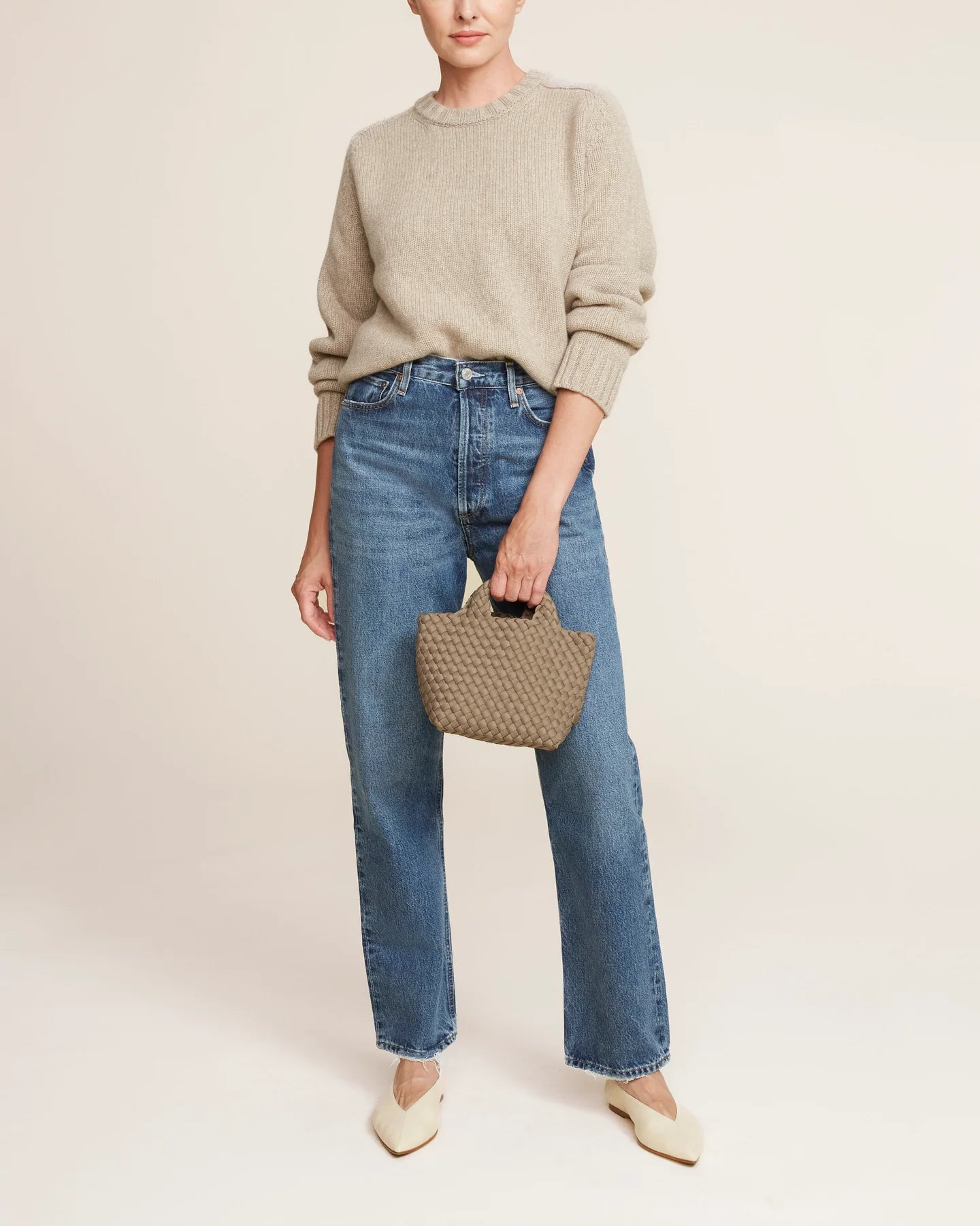 Handwoven neoprene in taupe . The St. Barths Petit Tote transitions seamlessly from daytime to evening, carrying all your essentials comfortably.