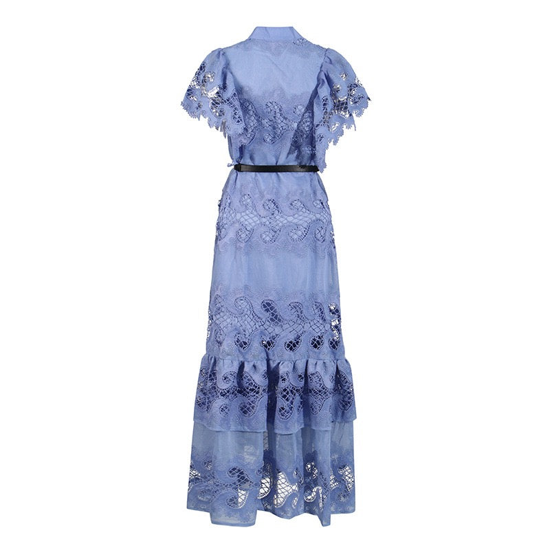 Collar Embroidered Waist Dress, Blue