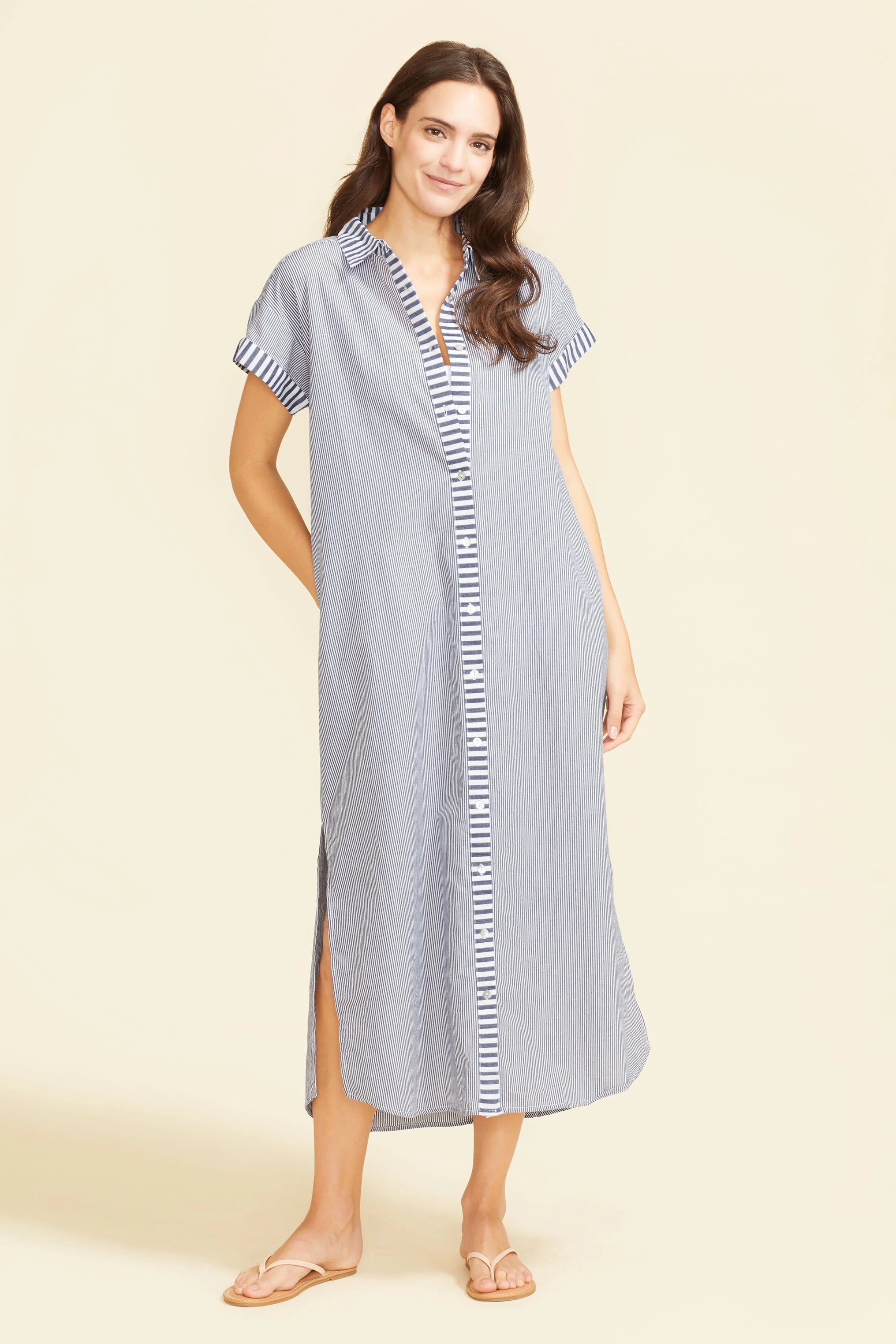 Made in a beautiful, striped cotton fabric, the Riga Midi Dress is the perfect maxi button-down. The crisp cotton fabric and front placket buttons placed all the way down the dress prove that the Riga Midi Dress is a versatile dress and cover-up you will want to wear year after year.
