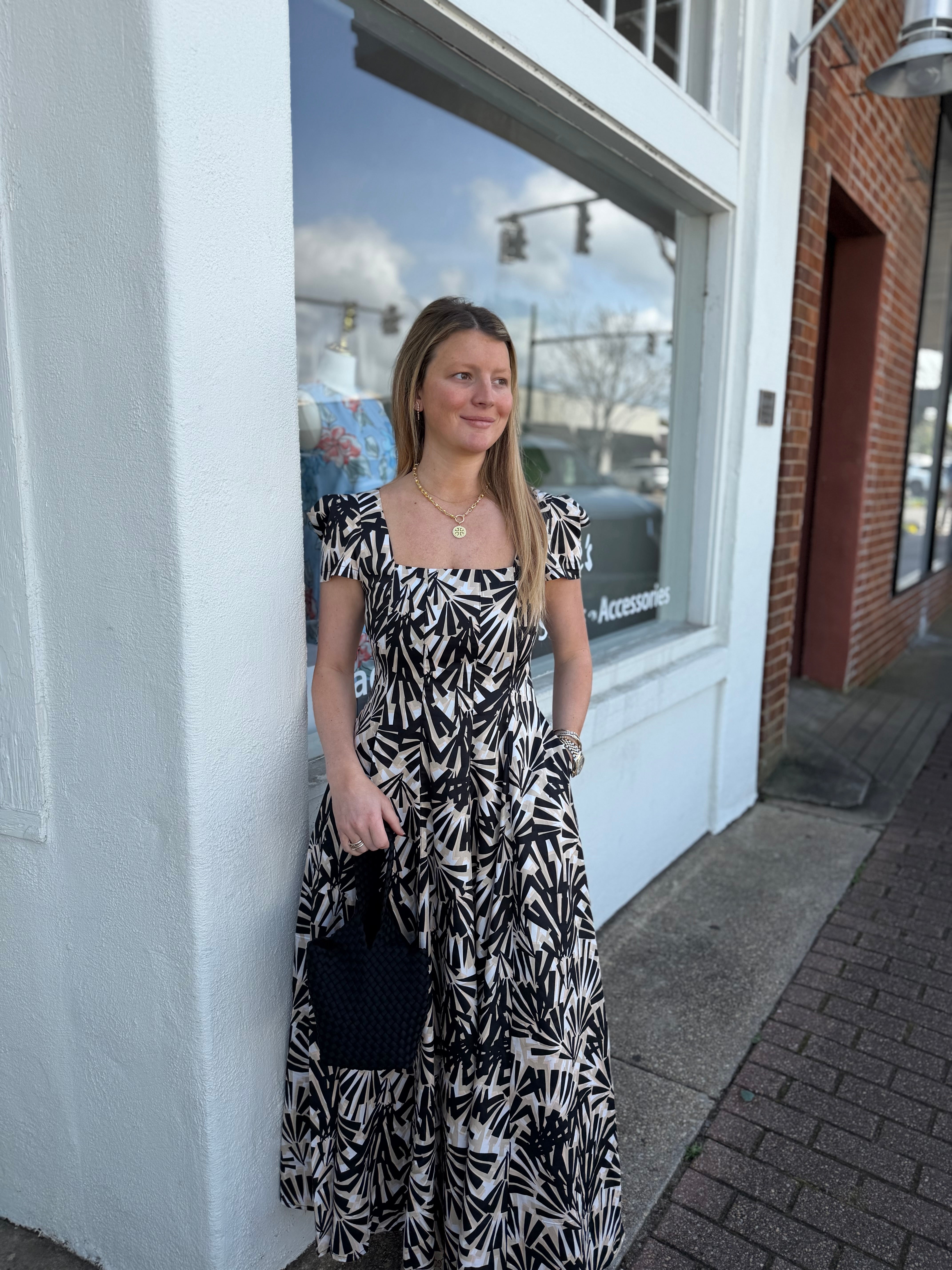 Effortless elegance meets everyday ease in this statement midi dress, crafted from a custom black-and-ivory cotton print that feels both timeless and modern. The softly structured bodice features a flattering square neckline and subtle puff sleeves that add just the right amount of feminine volume. A gently fitted waist flows into a breezy midi skirt designed to move beautifully with every step.