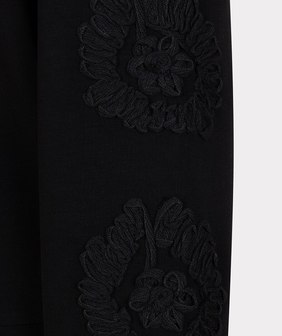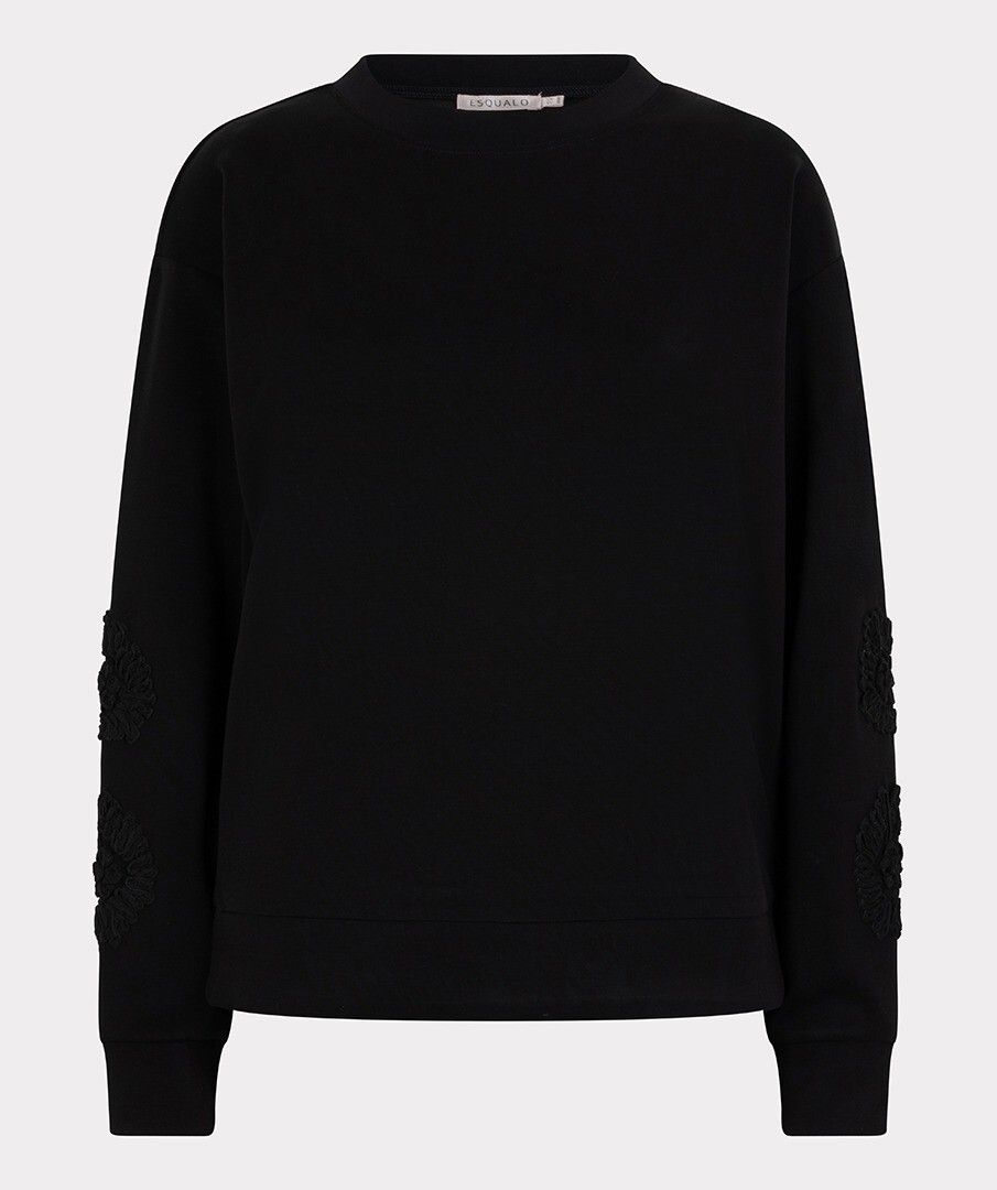 Comfy modal sweater with floral embroidery detail on the sleeves.
