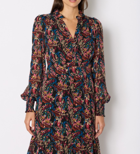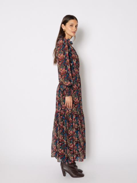 The RILA dress combines elegance and shine with its delicate floral lurex print. Its long, flowing cut, buttoned V-neck, and long sleeves offer a sophisticated and comfortable style, ideal for chic occasions.