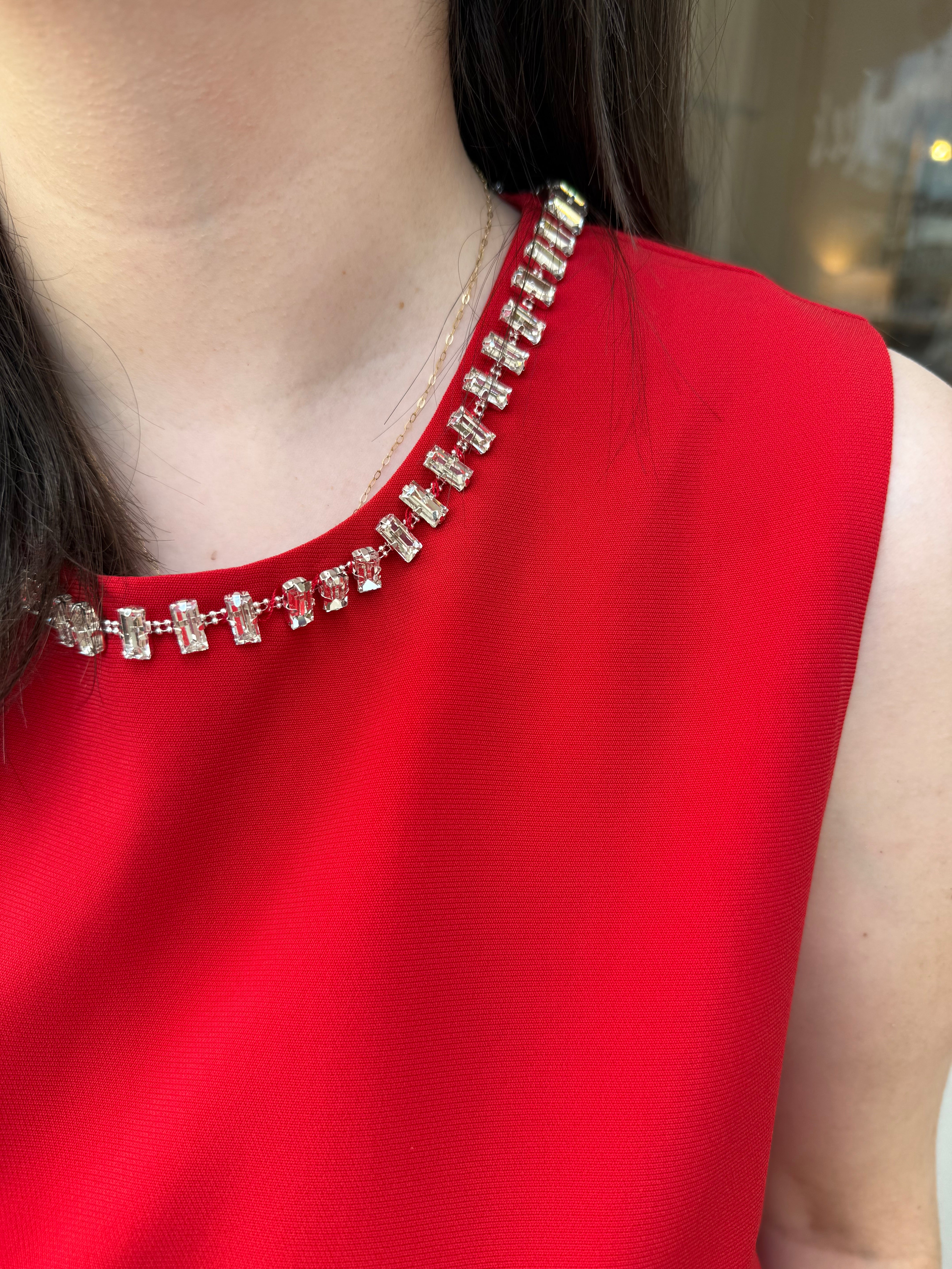 Simple, chic, and timeless—this sleeveless red shift dress is a wardrobe essential. Designed with a clean silhouette and subtle jeweled neckline detail, it’s the perfect piece to take you from workdays to special occasions. The easy, relaxed fit makes it both flattering and comfortable, while side pockets add a modern touch.