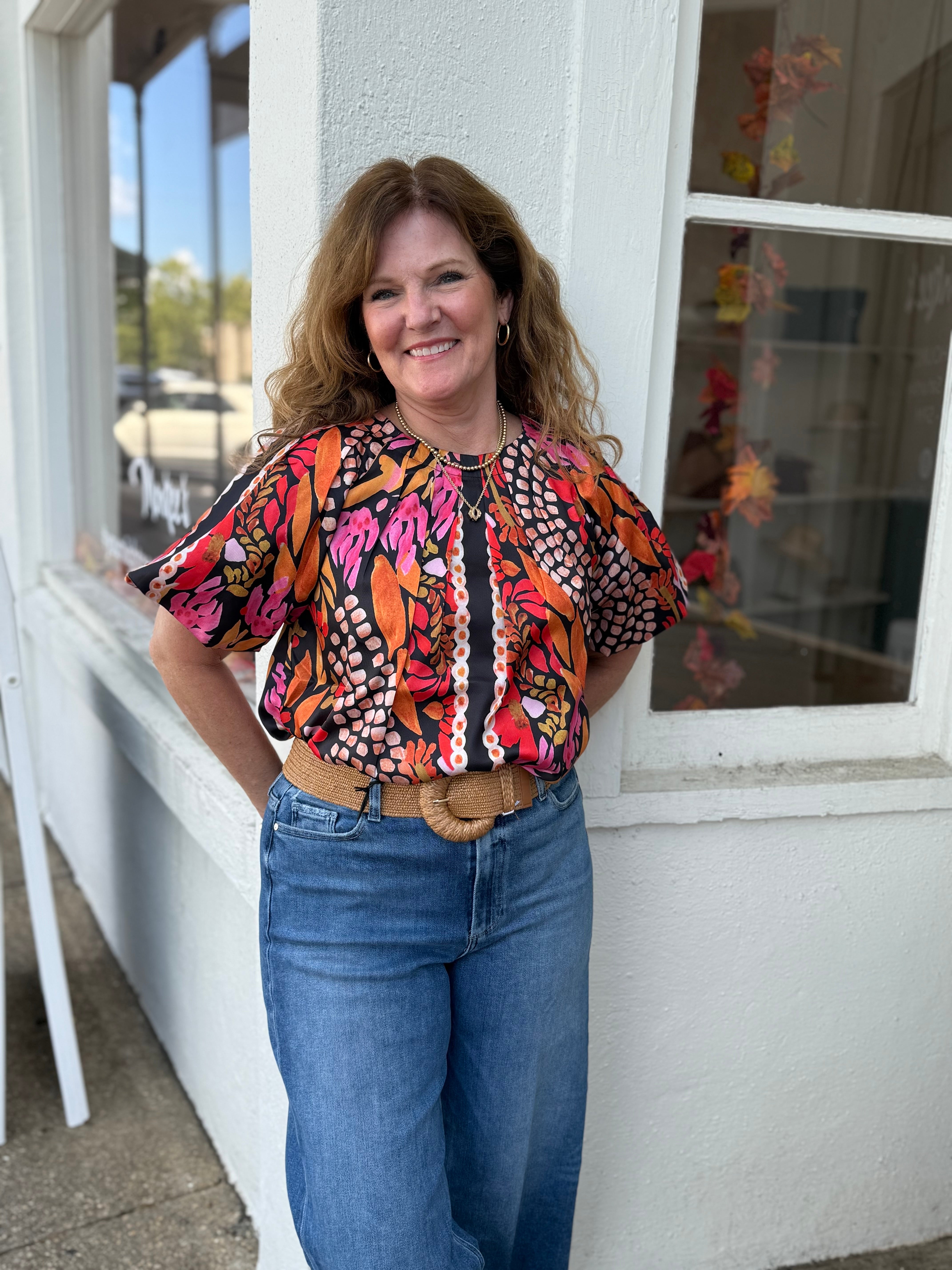 Bold, colorful, and easy to wear—this statement top features a relaxed fit, pleated neckline, and flutter sleeves. Perfect with denim or dressed up for a night out.