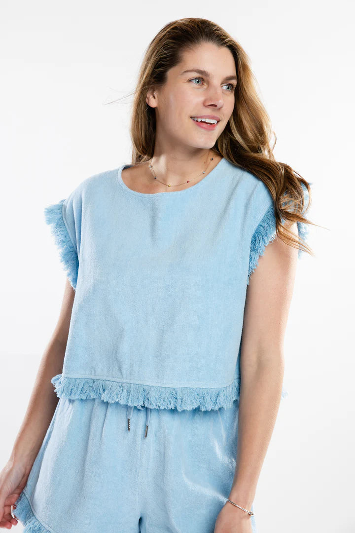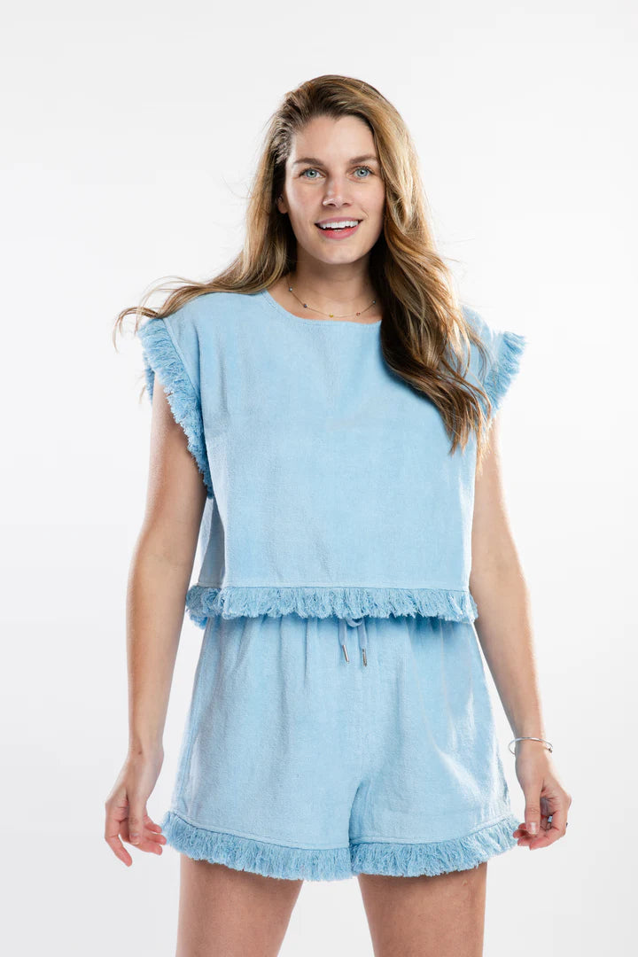 Introducing the Posey Cropped T-Shirt in Sky. This French terry set offers comfort and statement style, featuring a raw fringe hem on the cropped top and matching drawstring shorts with fringe detail. Soft and breathable, perfect for beach days, weekend getaways, or lounging in style. Mix and match with the Indie Short for a unique look.